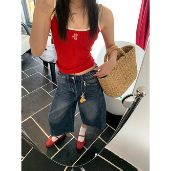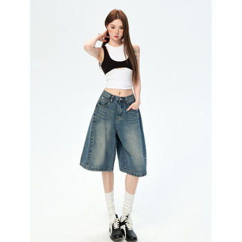 جينغ جينغ صيفي بنطال جينز نسائي مكون من خمس نقاط بخصر عالي ضيق إلى فضفاض كاجوال بنطال ساق عريضة بنطال دينيم على الطراز الأوروبي