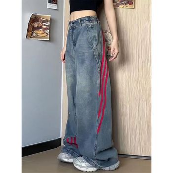 2025 kadın yüksek sokak Retro düz kot yüksek bel XL gevşek örtü geniş bacak pantolon çizgili dikiş için bahar sonbahar yüksek